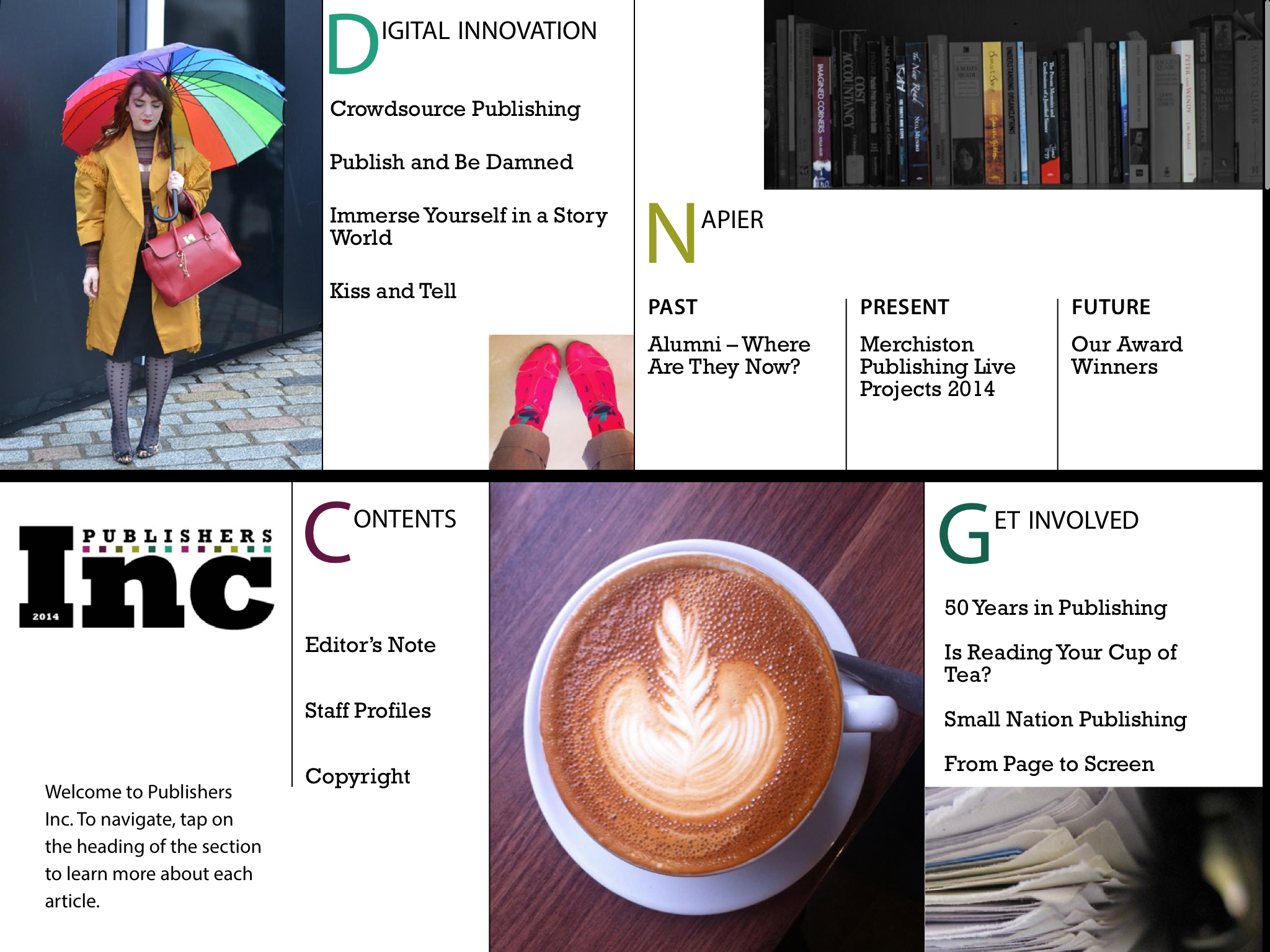 Publishers Inc 2016 is an interactive digital magazine created by Edinburgh Napier University postgraduate publishing students. It is our third year running as a digital magazine but for the first time this year, Publishers Inc is available on both tablet and desktop. The 2016 issue covers a variety of topics – from new ways of publishing content to the re-emergence of the Scottish comics scene. We also checked in with our alumni and pulled together advice for prospective publishers from industry professionals. Our editorial features are modishly concise with functional, yet beautiful design to grip readers’ attention.